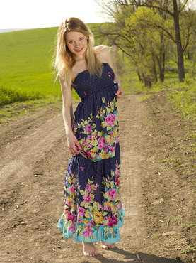 Молодая девушка с очень красивым лицом и телом прогуливалась по парку и найдя укромное место стала на фоне зеленых деревьев и задрала фиолетовый сарафан, показав что на ней нет не только трусиков, но и лифчика. Прекрасная фея старается выглядеть как можно более сексуально и принимает разные позы, не прикрывая вид на свою писю и молочные железы.