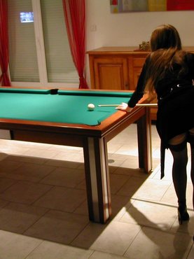 Стройная блондинка с брекетами на зубах залезла на бильярдный стол и сняла с себя не только майку и шортики, но и оранжевые трусики. Оставшись совершенно голенькой, привлекательная соблазнительница начала очень вызывающе позировать, активно показывая не только титьки первого размера, но и гладко побритую писечку, которая всегда готова пустить в себя член любого размера.