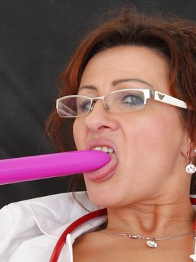 После рабочей смены взрослая сотрудница правоохранительных органом пошла домой и, закрывшись в комнате с розовыми стенами. начала позировать с дубинкой в руках и вскоре сняла с себя униформу. Оставшись только в черном корсете и чулках, строгая полицейская начала светить силиконовыми дойками, соски на которых соединены золотой цепочкой.
